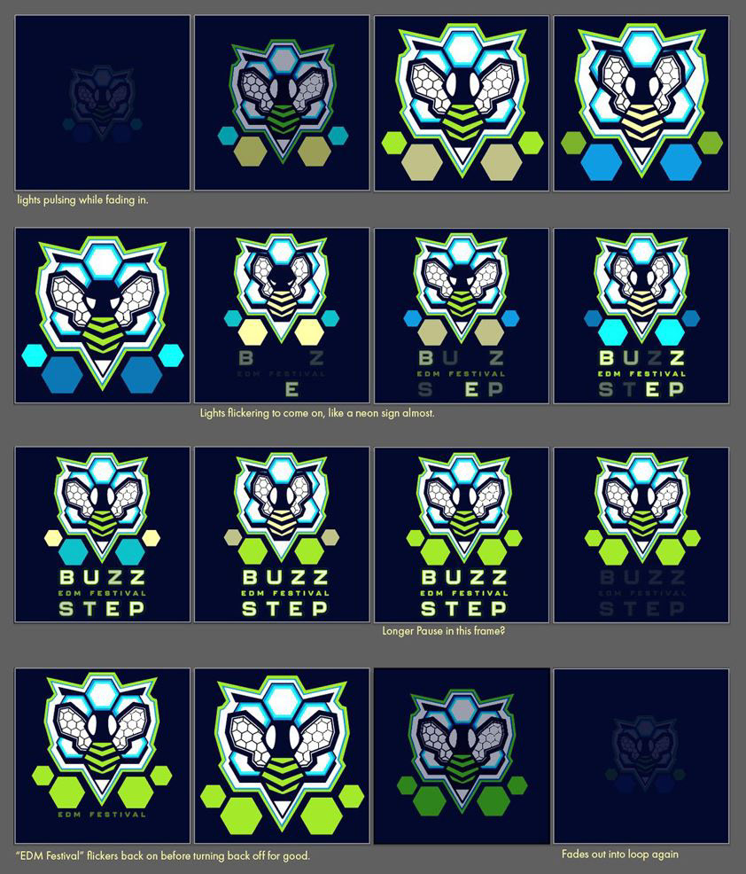 Tight deadlines were involved with the creation of social media graphics to advertise the festival, but with the brand's identity established, I was able to easily and efficiently create seasonal advertisements for merchandise, a call for artists, as well as a money raised announcement. Dancing to the beat, Buzzstep's bee mascot breathed life once more through similar animated effects of flickering neon letters and movements that interact with the electronic music.
