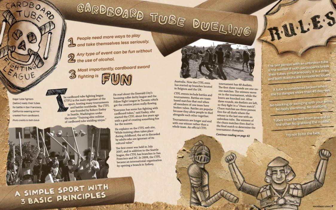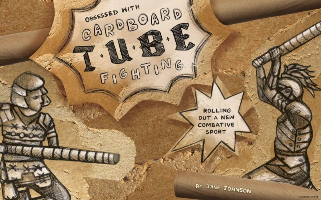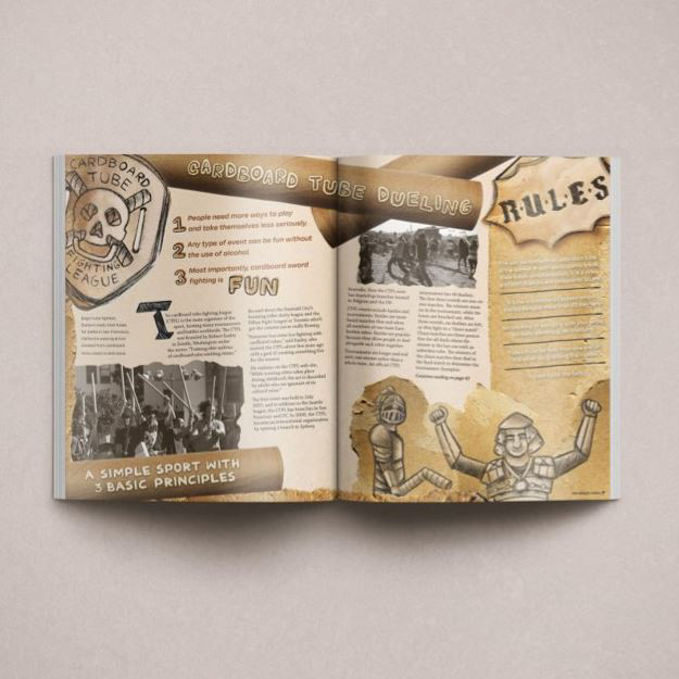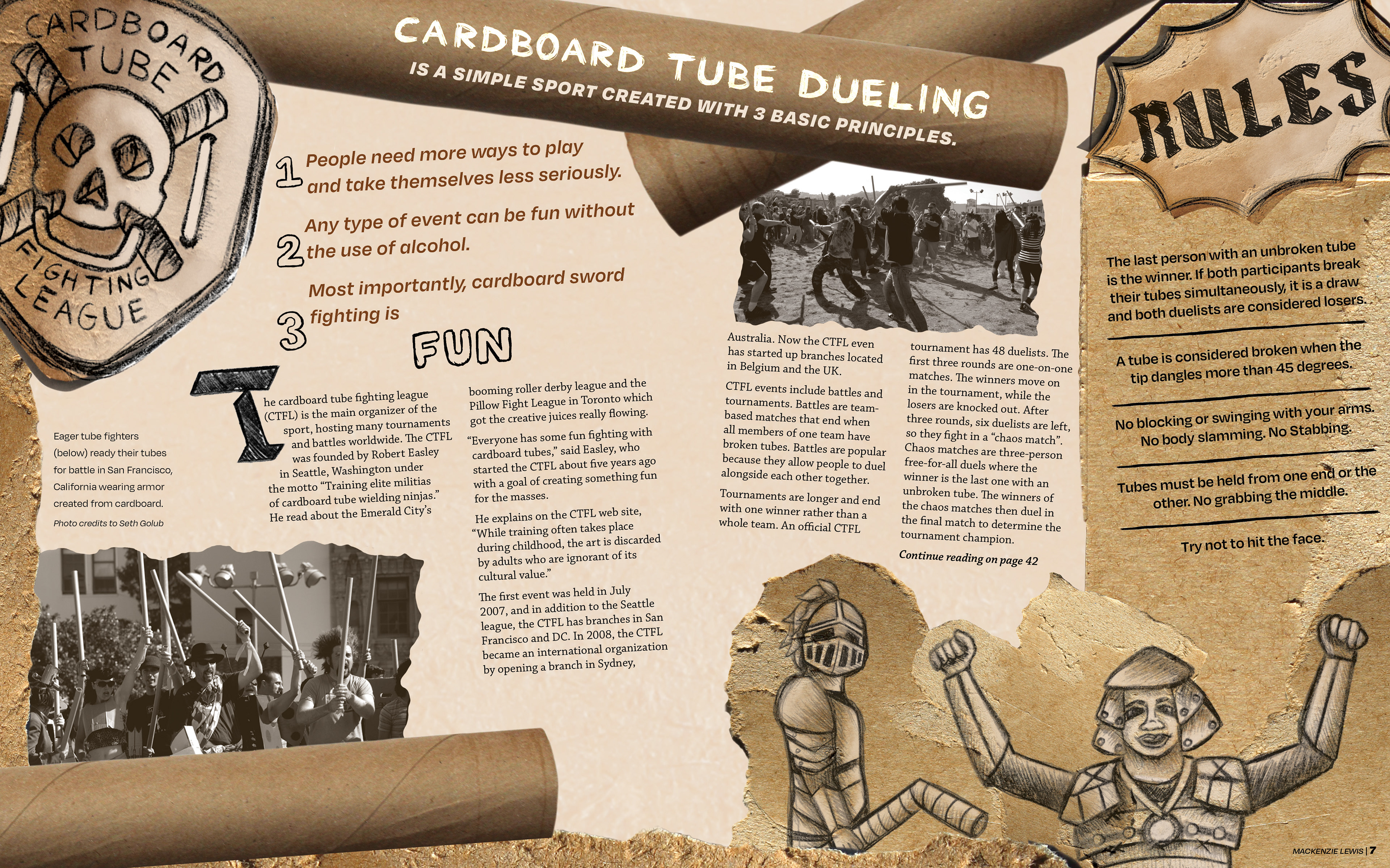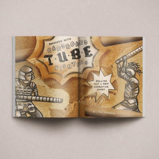 Gear up for an epic battle with the Cardboard Tube Fighting League (CTFL) in this double magazine spread full of all the information you need to know to become a cardboard tube duelist. A combination of sketchy illustrations, scratchy hand lettering, and collaging cardboard photography tell the story behind this unique sport.