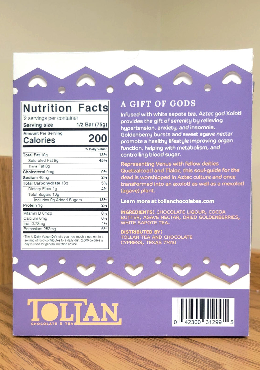 Indulge in a sweet tea time with even sweeter health benefits and cocoa in every product. Dark chocolate sweetened with Mesoamerican ingredients and inspired by the healing properties of Mexican herbal teas truly make Tollan products a gift of the gods. All representative of Venus in Aztec culture, chocolate god Quetzalcoatl provides the gift of happiness, twilight god Xolotl provides the gift of serenity, and rain god Tlaloc provides the gift of healing.